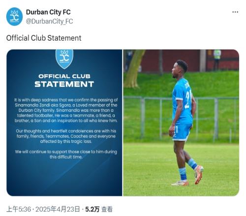两小时后,德班城再度发布公告,但传来的却是球员的死讯。公告写道:“我们怀着沉痛的心情宣布,德班城大家庭挚爱的成员西纳曼德拉-宗迪(Sinamandla Zondi)不幸离世。西纳曼德拉不仅是一位才华横溢的足球运动员,他还是我们的队友、朋友、兄弟、孩子,也是所有他身边的人的榜样。