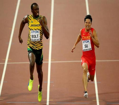 紧接着,同年8月23日的北京田径世锦赛中,苏炳添再次凭借9.99秒的成绩,成为首个闯入田径世锦赛男子百米决赛的黄种人。这次半决赛的田径赛场上,苏炳添右手边站着的对手是博尔特。在前半程的比赛中,苏炳添一度靠快起跑“带乱了博尔特”,虽然后半程被赶超,仍被解说员大赞“几乎击败了博尔特”。