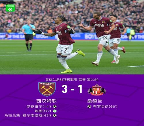 英超第22轮,西汉姆联客场2-1击败热刺,结束英超连续10场不胜。